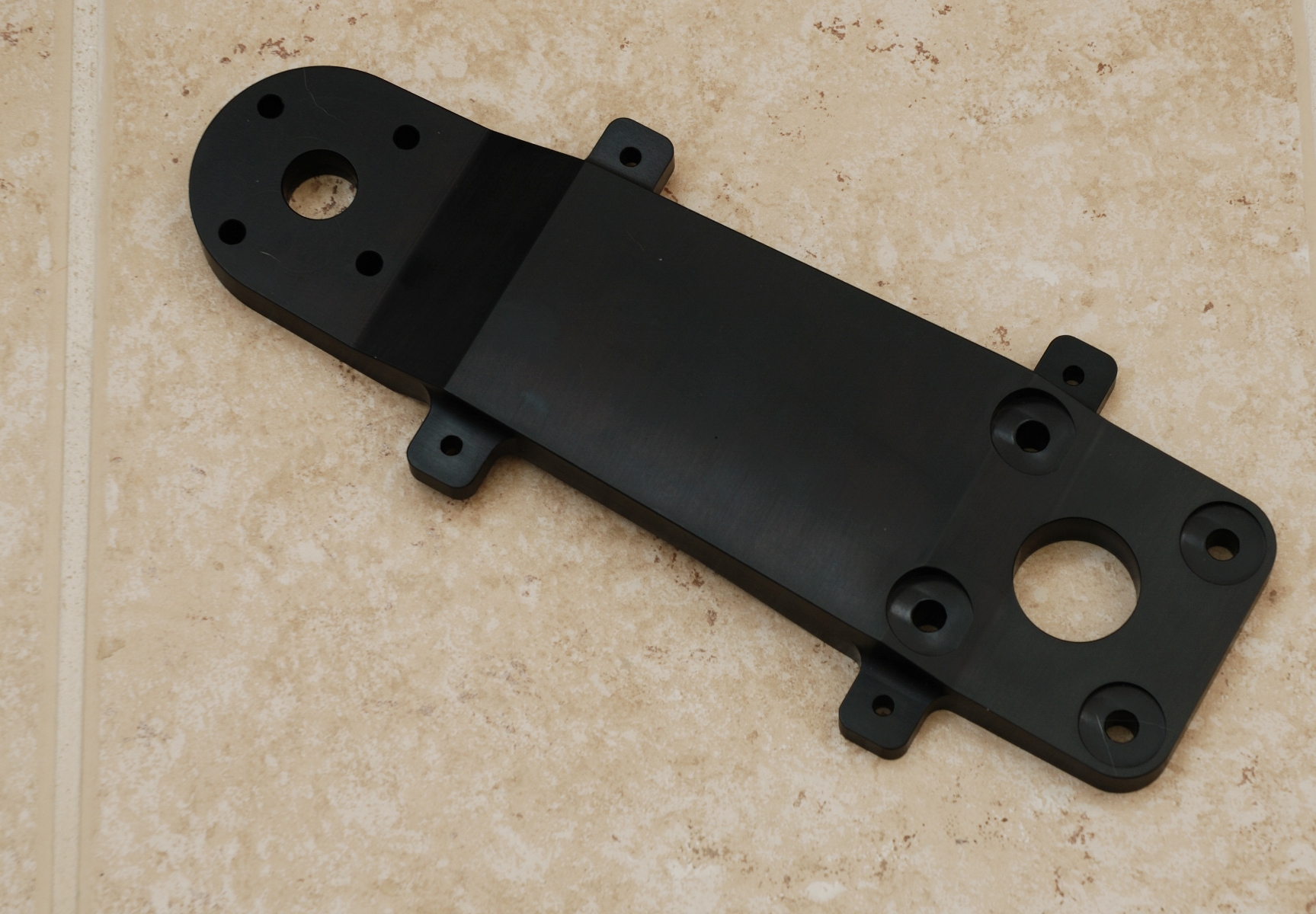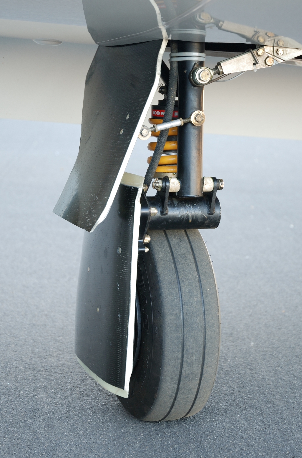 The approach used to solve this problem was to utilize a three piece design and improve the stiffness of the doors themselves. The new doors are made of carbon. They are geometrically identical to the original doors but have greatly increased stiffness. The new inner gear door is about half the size of the original. This enables it to exert much greater vertical force on the overlap with the center door. The center door is attached to the main gear trailing link arm using four stand-offs. A new trailing link arm was fabricated to provide mounting tabs for the new door. The wide mounting foot print provides a solid base which further adds stiffness.